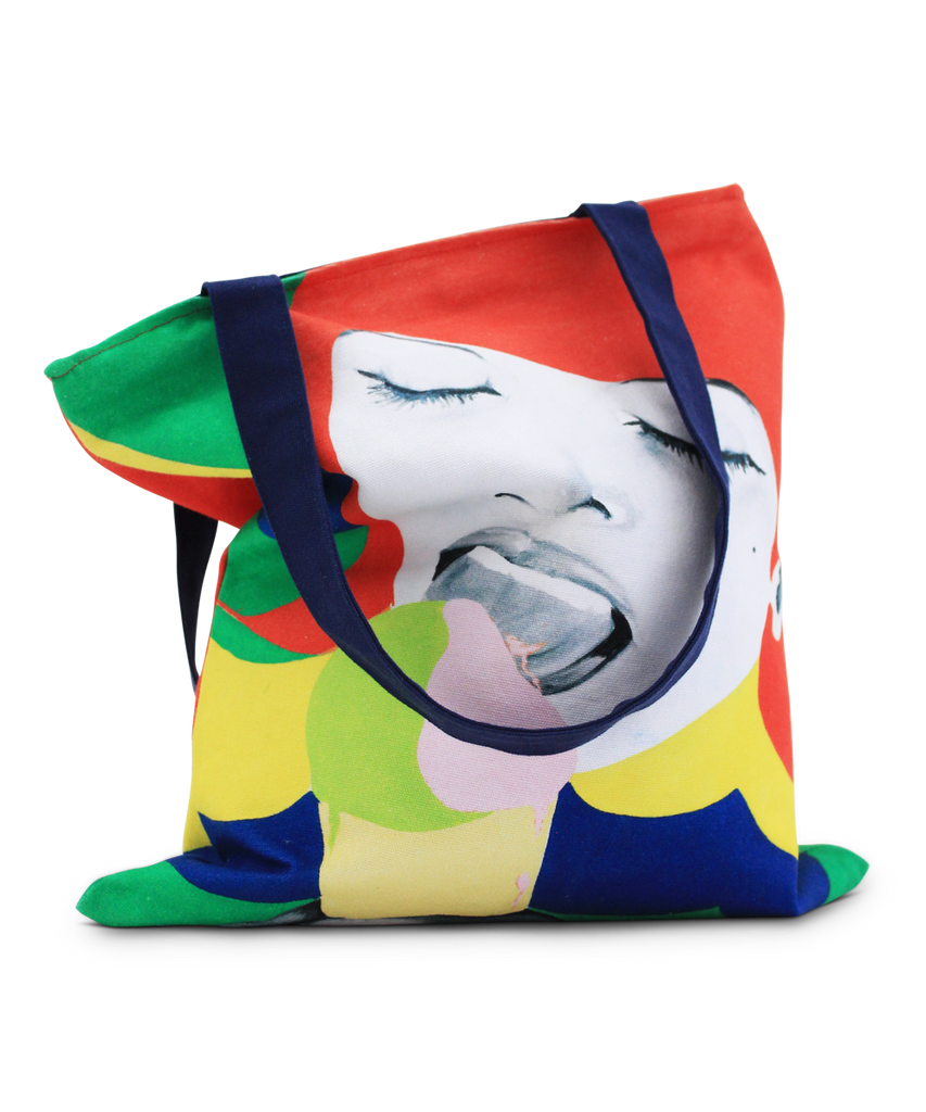 Evelyne Axell was a Belgian Pop painter. She is best known for her psychedelic, erotic paintings of female nudes and self-portraits on plexiglas that blend the hedonistic and Pop impulses of the 1960s. her woman licking ice cream which featured on this tote was actually banned on facebook when posted in 2015, much to everyone's protest!